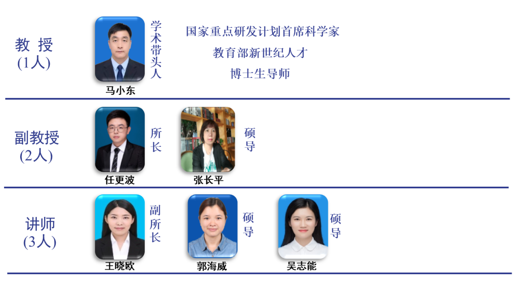 团队现有教授1人,副教授2人,讲师3人。