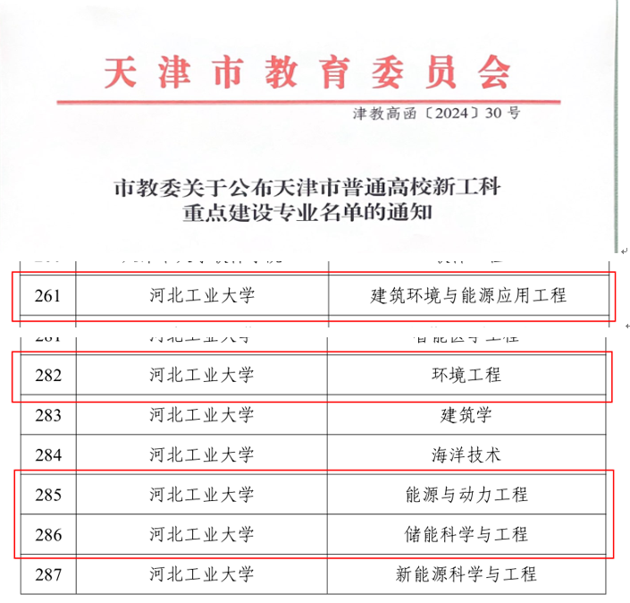 近日,天津市教育委员会印发了《市教委关于公布天津市普通高校新工科重点建设专业名单的通知》,公布天津市普通高校新工科重点建设专业名单,能源与环境工程学院能源与动力工程专业、环境工程专业、建筑环境与能源应用工程专业和储能科学与工程专业获批天津市普通高校新工科重点建设专业。