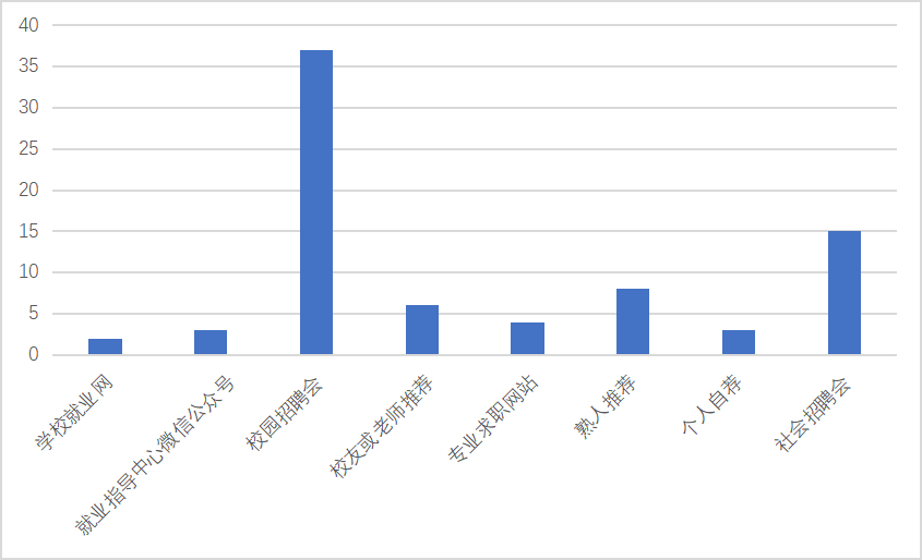 统计显示,365best官网已就业的毕业生中,获得工作的主要渠道为校园招聘会,其次依次为社会招聘会、专业求职网站、熟人推荐、校友或老师推荐等。因此,在今后的工作中,我们要一如既往的重视校园招聘,并注重开发新的就业渠道,为学生提供更多的就业机会。
