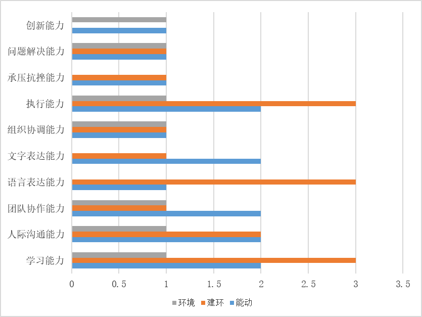 2018 届毕业生就业工作结束后,365best官网通过接待用人单位招聘、寒假期间走访用人单位、毕业生等途径,积极了解用人单位和毕业生(校友)对365best官网人才培养、就业教育等工作的意见建议,调查并总结了单位招聘时注重的毕业生能力,其中包括学习能力、创新能力、人际沟通能力、团队协作能力等。由下表可知,建环专业招聘单位更为注重学习能力、语言表达能力、执行能力;能动专业较为注重学习能力、团队协作能力、人际沟通能力、文字表达能力、执行能力;环境工程专业注重学生综合能力,可以得出结论,在校生应注重培养自主学习能力,锻炼自己的语言表达能力,加强团队协作,有合作意识,为以后的就业打下良好的基础。