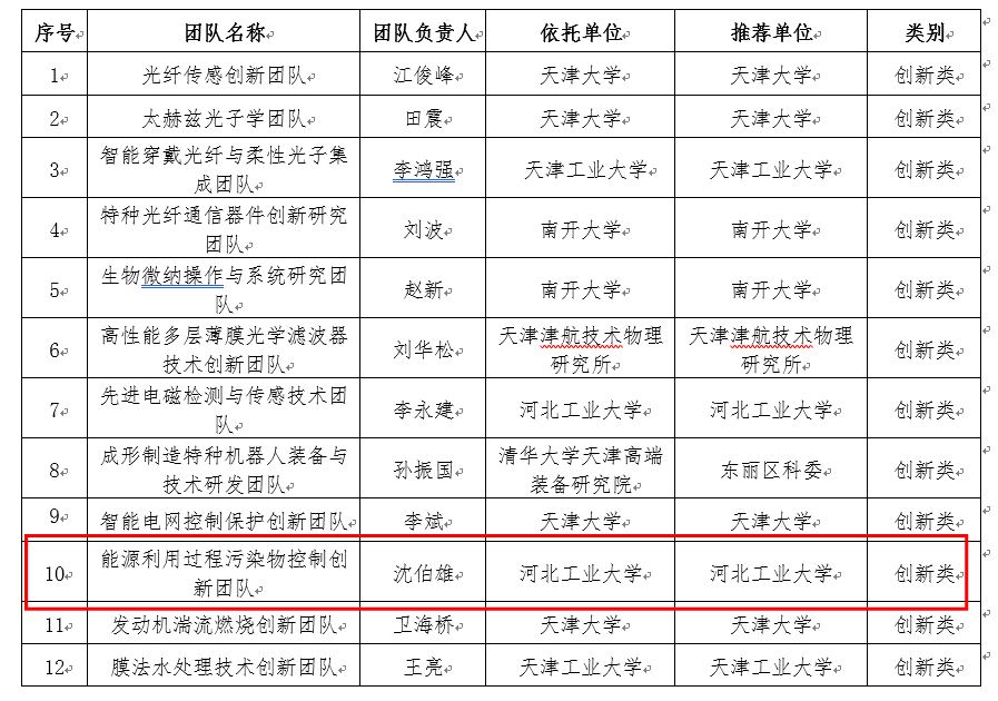 365best官网沈伯雄教授领衔的“能源利用过程污染物控制创新团队”入选第三批天津市人才发展特殊支持计划高层次创新创业团队