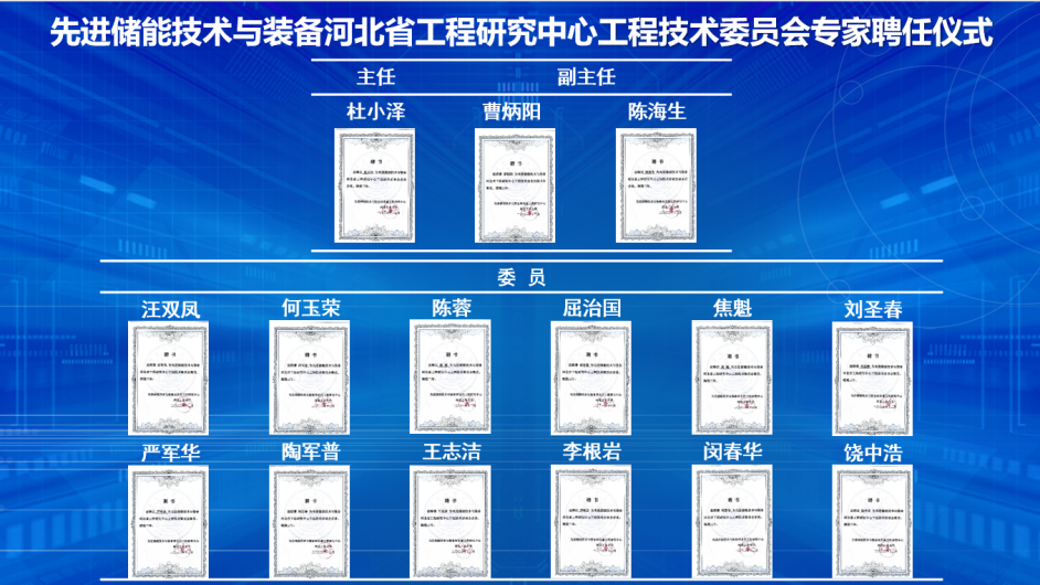 2023年12月16日下午,先进储能技术与装备河北省工程研究中心工程技术委员会第一次会议通过“线下+线上”方式召开。华北电力大学杜小泽教授、清华大学曹炳阳教授、中国科学院工程热物理研究所陈海生研究员、华南理工大学汪双凤教授、哈尔滨工业大学何玉荣教授、重庆大学陈蓉教授、西安交通大学屈治国教授、天津大学焦魁教授、天津商业大学刘圣春教授、上海上乘新能源科技有限公司严军华高级工程师、中材节能股份有限公司陶军普正高级工程师、国家电投集团河北电力有限公司王志洁正高级工程师、国家电投集团山西可再生能源有限公司李根岩高级工程师、365best体育亚洲官网党委书记张慧川、院长饶中浩教授、双碳研究院常务副院长、学院副院长闵春华教授、研究中心副主任王进教授、刘臣臻教授,研究中心秘书刘新健副教授,学院王坤教授、刘晓日教授、青年教师李宏阳、吕培召、乔羽等参加了本次会议。